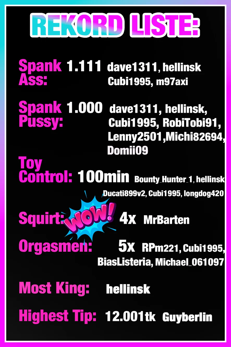 블로우잡, 핑거링, 섹스 기구, 딜도 또는 바이브레이터, 도기 스타일, 자지 평점, 음란한 대화, 하이힐, 나일론, 니플 기구, 핸드잡, 트월킹, Fussfetisch, Footjob, Dirtytalk, moan Name, full Naked, Countdown, Nippleteasing, Spitting, Fingern Pussy, Feet Licking, 굴욕, 자위, 스트립쇼, Herrin, Outfitwechsel, Lack, Squirt with your Help, Sklave, Dildo, Fake Sperm, Dildo ride, 하드코어, 애널 기구, 딥스로트, SPH(작은 음경 능욕), 롤플레이, 오르가즘, 오일 쇼